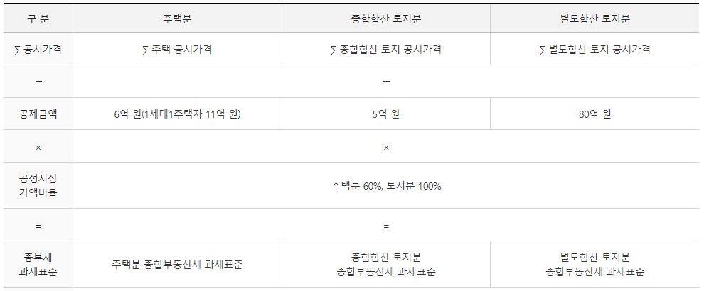 과세표준 --> [과세유형별 전국합산{공시가격 × (1-감면율)}- 공제금액(과세기준금액)] × 공정시장가액비율