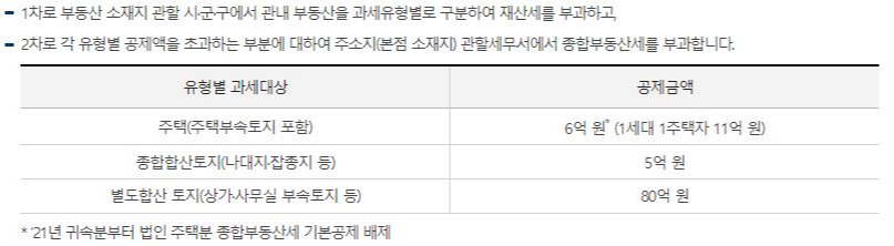 - 주택 : 전국 합산 주택의 공시가격 합계액이 6억원(1세대 1 주택자 11억 원)을 초과하는 자 (단, 21년 귀속분부터 법인 주택분 기본공제 6억 원 적용 배제)