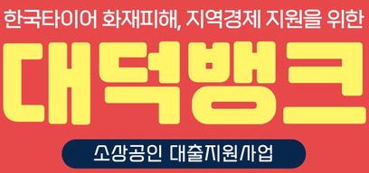 대전 대덕뱅크가 [2023년 대덕뱅크(소상공인 지원사업)]을 실시합니다. 2023년 3월 12월 발생한 대덕구 한국타이어 화재 사고로 지역 경제의 침체를 겪고 있는 소상공인을 지원합니다. 소상공인의 경영자금을 좋은 조건으로 지원하여 한국타이어 화재 피해의 회복을 돕고 지역경제를 활성화하기 위함입니다.