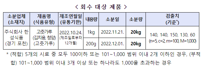 식품의약품안전처(식약처)는 식품소분업체인 '주식회사 한성식품(경기 포천시 소재)'이 소분하여 판매한 고춧가루가 식중독균인 "클로스트리디움 퍼프린젠스"기준 부적합으로 확인됨에 따라 해당 제품을 판매 중단하고 회수조치하기로 했습니다.