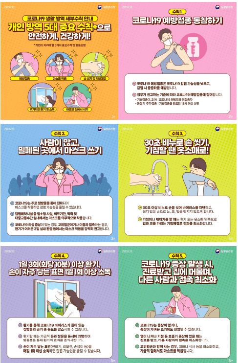 - 기본 방역 수칙 강조 : 손 씻기, 환기 및 소독, 마스크 착용(의무 및 권고상황에 한정), 기침예절 준수 등 실천 및 교육 홍보 강화