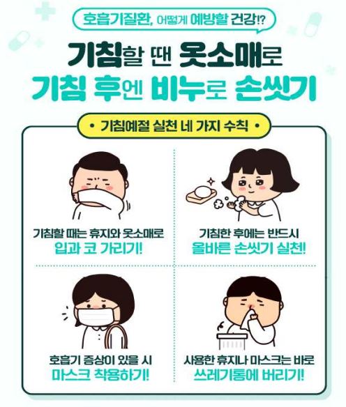 - 30초 비누로 손 씻기, 기침예절(옷소매에) 지키기