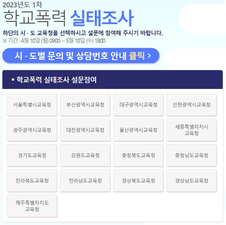 2023년도 1차 학교폭력 실태조사 하단의 시 · 도 교육청을 선택하시고 설문에 참여해 주시기 바랍니다. ※ 기간 : 4월 10일 (월) 09:00 ~ 5월 10일 (수) 18:00 시 · 도별 문의 및 상담번호 안내 클릭 하단