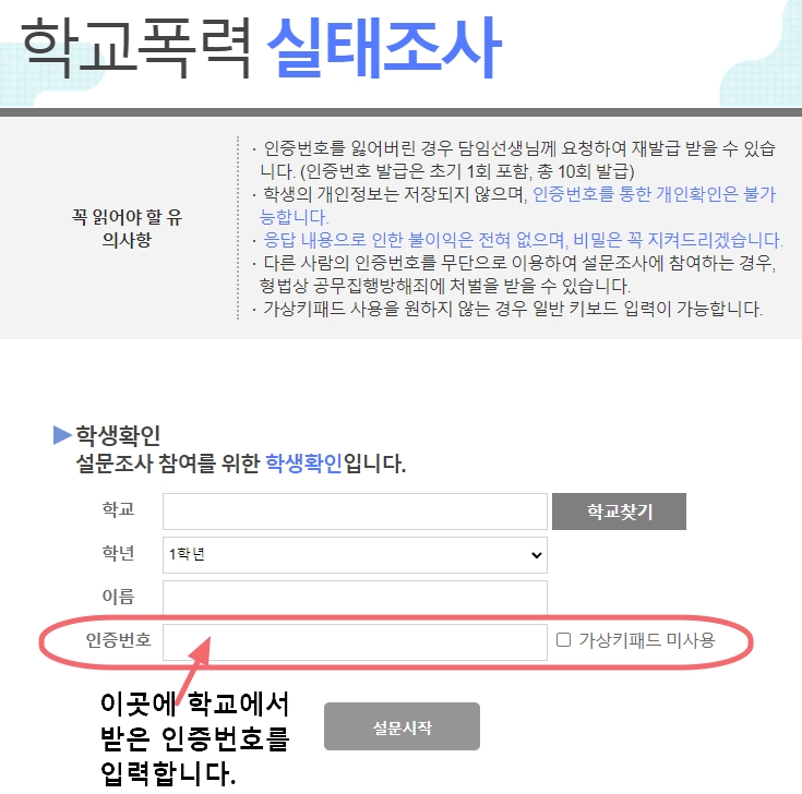 학교에서 담임선생님께 받은 인증번호가 있어야 설문조사를 할 수 있습니다.