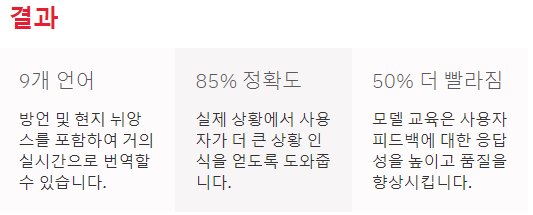 - 실시간 번역서비스 : 특정 방언 발음, 원어민 발음 등의 다양한 방언과 현지 뉘앙스를 위한 광범위한 데이터 소싱 및 다량의 음성녹음을 바탕으로 한 머신 러닝(구어체, 방언의 이해)