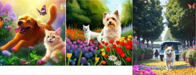 동물의 경우 개와 고양이와 나비가 다 표현된 경우는 마이크로소프트 빙(달리)이 유일했습니다.