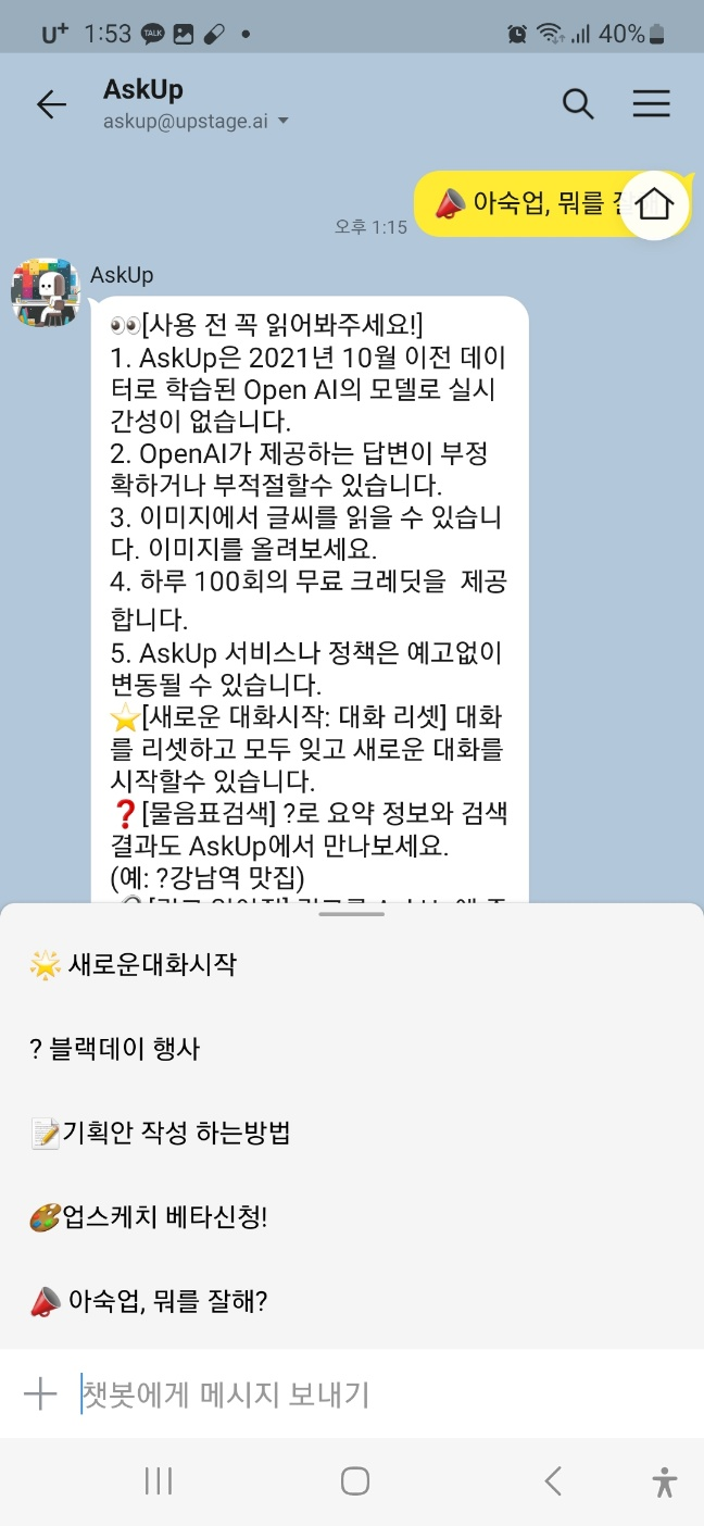 일단, 한번 사용해 볼 생각이 있다면, 안전하고, 무료이면서 카카오톡에서 쉽게 사용할 수 있는 뤼튼과 아 숙업을 추천합니다.