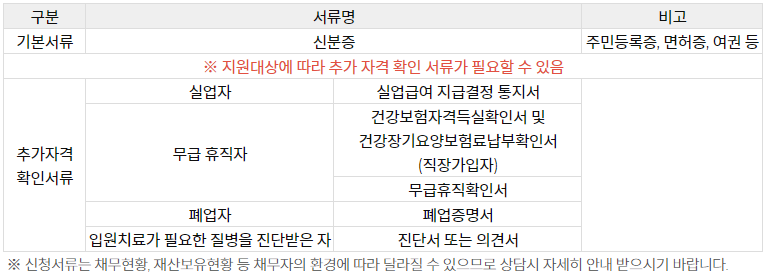 - 신용회복지원협약 제4조 제5항에 따라 개인채무조정 신청 제외대상에 해당하지 않는 자